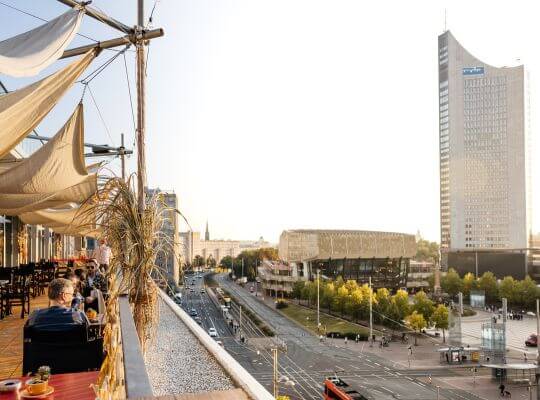 Ein echtes Highlight ist das im Haus gelegene Felix: Hier finden Sie die Felix Rooftop Bar und unsere exklusive Eventlocation, die jedes Event zu einem besonderen Erlebnis über den Dächern Leipzigs macht. Auf der großen Dachterrasse genießen Sie erfrischende Drinks, kreative Snacks und einen atemberaubenden Blick auf den Augustusplatz, perfekt für entspannte Abende.