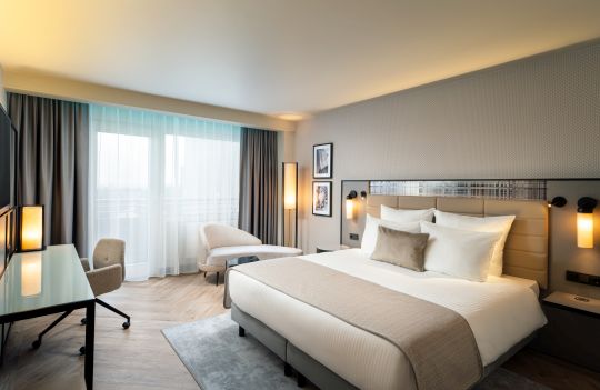 Die 330 modernen Zimmer sind in warmen Beigetönen gestaltet und bieten Eleganz, Komfort und Ruhe. Bequeme Matratzen, verschiedene Kissen sowie Ausstattung mit Smart-TV, Minibar, kostenfreiem WLAN und Kaffee-/Tee-Station sorgen für hohen Standard. Superior-Zimmer verfügen zusätzlich über eine Nespresso-Maschine, die Bäder über Regenduschen.